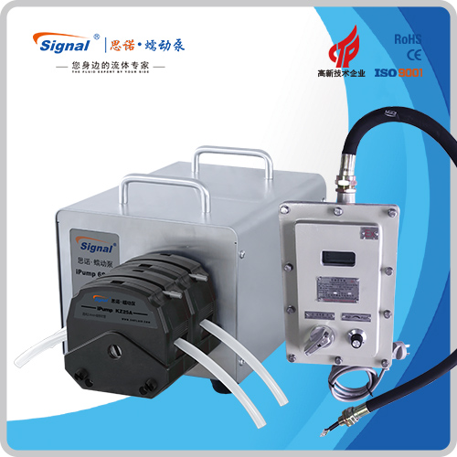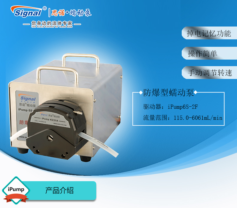 1.流量范圍:115.0-6061mL/min 2.免維護交流防爆減速電機驅動,變頻器調節轉速 3.電機扭矩大,可級聯雙泵頭 4.防爆等級DIIBT4,適合易燃易爆環境使用 5.304不銹鋼外殼,易擦拭,耐腐蝕,便于攜帶