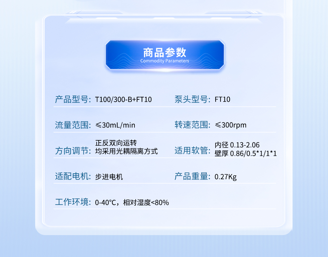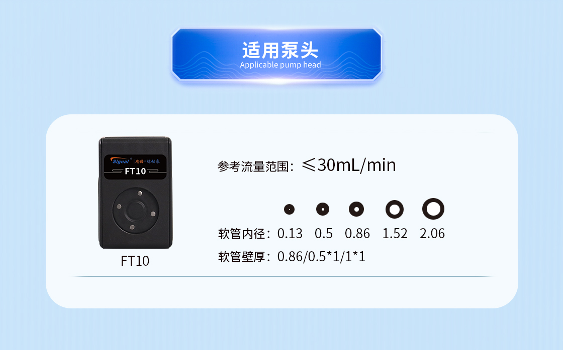 1.流量范圍:<30mL/min 2.控制與泵頭一體化設計,整體更加緊湊 3.上蓋與壓塊聯動機構,安裝軟管更方便 4.彈管壓塊,可適配多種軟管 5.步進電機驅動 6.透明觀察窗可方便查看泵頭運行狀態 7.開蓋傳感器(選裝):泵蓋打開,自動報警或:停止運行