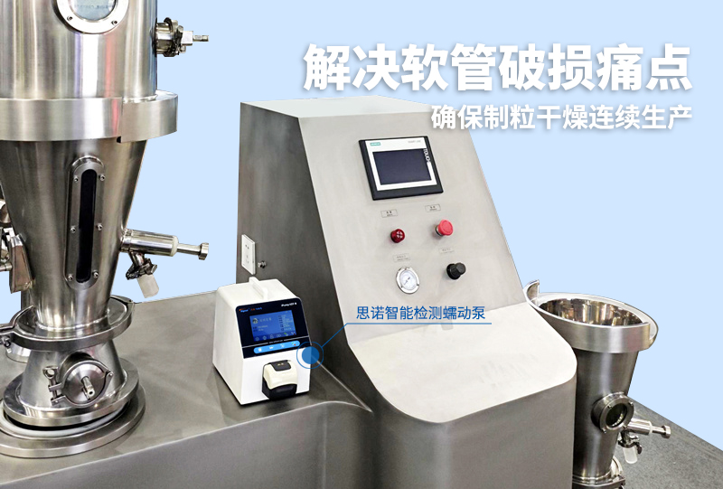 在固體制劑生產(chǎn)中,制粒干燥機(jī)需要通過蠕動(dòng)泵將粘合劑等液體物料提升至一定高度(即具備足夠的蠕動(dòng)泵揚(yáng)程),穩(wěn)定輸送到混合制粒腔內(nèi)。這一過程對(duì)蠕動(dòng)泵的性能提出了雙重挑戰(zhàn):它既需要克服垂直管道帶來的阻力與壓力,保證流量的穩(wěn)定;又不能因軟管長(zhǎng)期承壓運(yùn)行而破損導(dǎo)致的泄漏風(fēng)險(xiǎn)。一旦在高揚(yáng)程工況下發(fā)生泄漏,液體不僅浪費(fèi),更可能自上而下灑落,對(duì)下方設(shè)備造成廣泛的污染與電氣安全隱患。