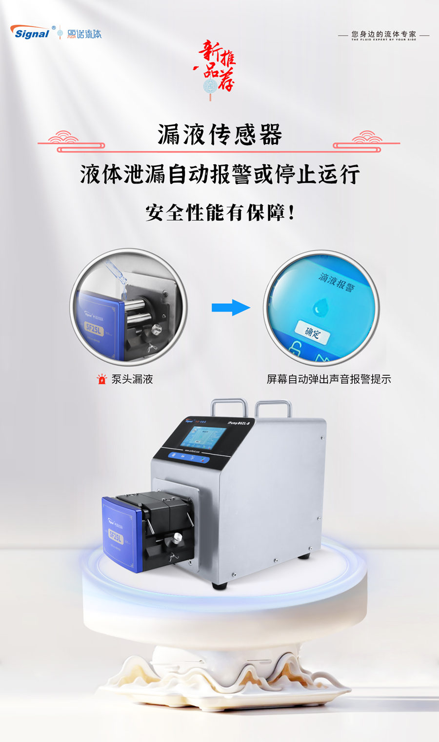 這款新品蠕動泵還配備了可選裝的漏液傳感器。這一傳感器能夠實時監測泵頭內部的液體泄漏情況,一旦檢測到泄漏,將立即觸發報警或自動停止泵的運行。