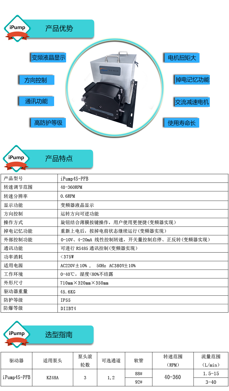 流量范圍:1.5-40L/min 彈性壓管結構,軟管壽命長,非常適合大流量液體傳輸 免維護交流減速電機驅動,變頻器調節轉速 全金屬泵頭,高精度,更可靠 防爆等級DIIBT4,適合易燃易爆環境使用