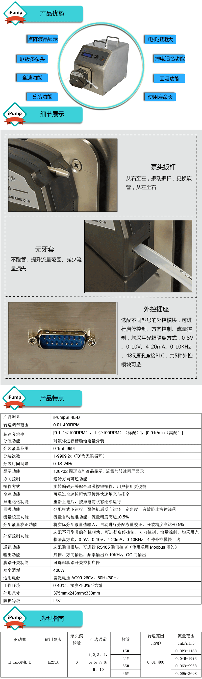 1.流量范圍:0.029-3698mL/min 2.兩種工作模式,流量模式與分配模式可選 3.具有流量校正、分裝液量校正功能 4.分裝精度高達±0.4%以內 5.采用伺服電機驅動,控制準,動力強勁 6.線路板全部三防漆處理,防腐、防潮